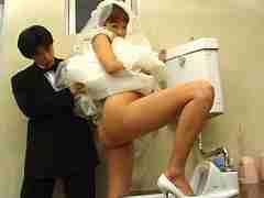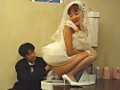 純白のウェディングドレスを新郎に捲ってもらい、便所で小便する花嫁。フェラチオしながら放尿し男をいかせ、オナニー放尿では自らいってしまうスケベ花嫁。ソファーの上から見事な放物線を小便で描く姿には興奮してしまう。