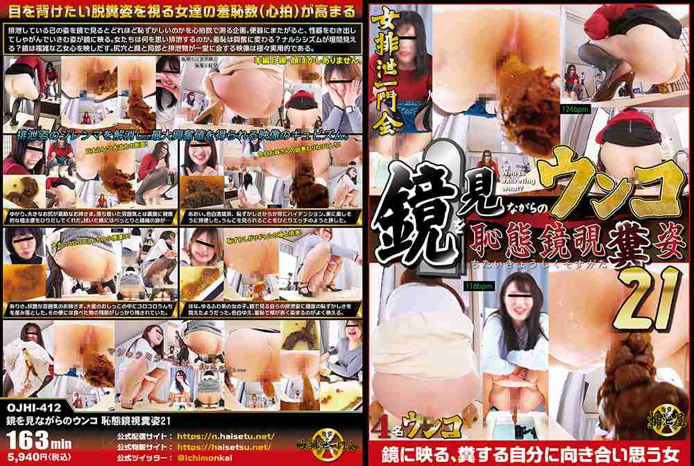 「排泄している己の姿を鏡でマジマジ見る」という行為が、どれほど羞恥を感じるものなのかを心拍数モニターで確認しながらその様子を観察するという複雑な企画。なのだが、さらに一ひねり。鏡が実はマジックミラーになっていて、その向こうにもカメラがあるということを彼女たちは知らないという状況。謹製便器台にまたがり、しゃがむと、前面にある鏡に、自ら性器をむき出して、はしたない格好でしゃがんでいきむ姿がありありと映る。彼女たちの感じている昂りは心拍数の高まりでわかる。女たちは何を感じ、どう思いながら排泄をするのか。羞恥は興奮に変わる?自己愛が、ナルシシズムが垣間見える?鏡は、複雑な乙女心を映しだす。尻穴と顔と局部と排泄物。全てが一堂に会する映像が極々実用的である。【ゆかり】大きなお尻が素敵なお姉さま。落ち着いた雰囲気とは裏腹に健康的な極太便をひりだしてくれた。拭いた紙にはべっとりと繊維の跡が…。【あおい】色白清楚系、恥ずかしさからか常にハイテンション。実に楽しそうに排便した。うんこを見られることをひとりエッチのようと評した。【ありさ】妖艶な雰囲気のお姉さま。大量のおしっこの中にコロコロうんちを産み落とした。その便には食べた物の残骸がしっかり残されていた。【はな】ゆるふわ系の女の子。鏡で見る自らの排泄姿に極度の恥ずかしさを覚えたようだった。色白ゆえ、羞恥で頬が赤く染まるのがよく映える。 排泄屋 ※本編顔出し