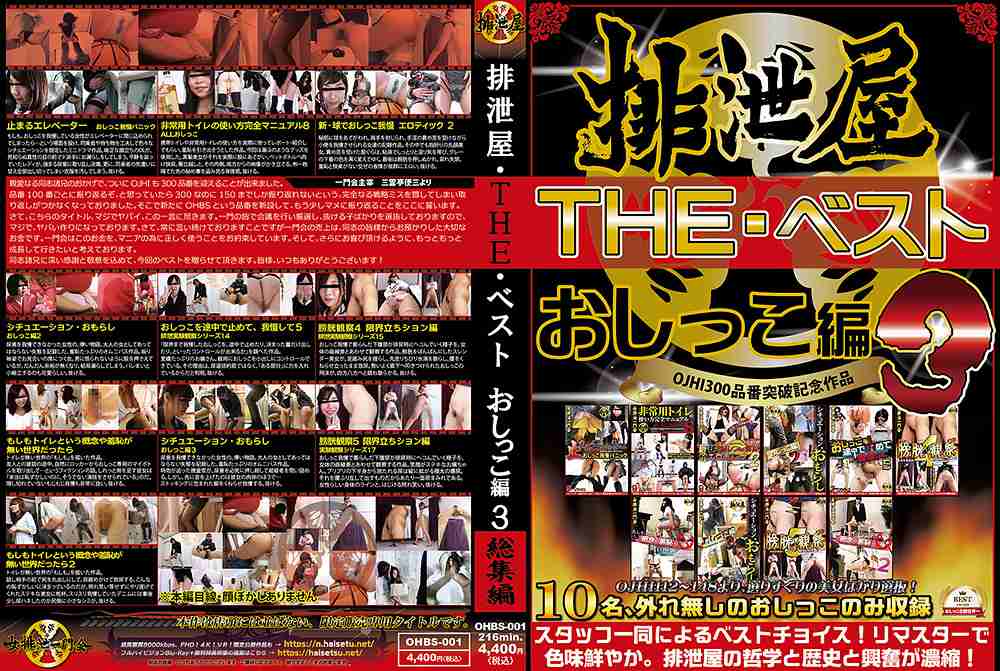 親愛なる同志諸兄のおかげで、ついにOJHIも300品番を迎えることが出来ました。品番100番ごとに振り返るぞ、と思っていたら300なのに150までしか振り返れないという、完全なる戦略ミスを冒してしまい取り返しがつかなくなっておりました。そこで新たにOHBSという品番を新設して、もう少しマメに振り返ることをここに誓います。さて、こちらのタイトル、マジでヤバイ、この一言に尽きます。一門の皆で会議を行い厳選し、抜ける子ばかりを選抜しておりますので、マジで、ヤバい作りになっております。さて、常に言い続けておりますことですが一門会の売上は、同志の皆様からお預かりした大切なお金です。一門会はこのお金を、マニアの為に正しく使うことをお約束しています。そして、さらにお喜び頂けるように、もっともっと成長して行きたいと考えております。同志諸兄に深い感謝と敬意を込めて、今回のベストを贈らせて頂きます。皆様、いつもありがとうございます!もしも、おしっこを我慢している女性がエレベーターに閉じ込められてしまったら…という場面を設け、同乗者や持ち物を工夫して色々なシチュエーションを設定したミニドラマ作品。端正な顔立ちのOLが、見知らぬ異性の目の前でド派手にお漏らしをしてしまう。平静を装っていたレディが、強まる尿意に取り乱し決壊。更に、同乗者の気遣いに甘え全部出し切ってしまい衣服を汚してしまう。抜ける。携帯トイレや非常用トイレの使い方を実際に使ってレポート・紹介してもらい、羞恥を引き出そうとした作品。今回は漏斗のようなグッズを使用した。黒髪美女がそれを実際に股にあてがい、ペットボトルへ向け放尿。衝立越しと、その内側。両方からの映像がかき立てる、布一枚隔てた先の秘め事を盗み見る背徳感。抜ける。秘部に球をあてがわれ、両手を封じられ、手淫の責め苦を受けながら小便を我慢させられる女達の記録作品。その中でも指折りの丸顔美女。責め苦を受けた股ぐらは、粘液でしっとりと湿り気を帯び、グレーの下着の色を黒く変えてゆく。最後は膀胱を押しぬかれ、哀れ失禁。羞恥と快楽がない交ぜの表情が抜群にエロい。抜ける。尿意を我慢できなかった女性の、儚い物語。大人の女としてあってはならない失態を記録した、羞恥たっぷりのオムニバス作品。振り袖姿でお見合いの席につく女。男に悟られないように股を押さえているが、だんだん余裕が無くなり、結局漏らしてしまう。バレまいと小細工するのも可愛らしい。抜ける。「限界まで我慢したおしっこを、途中で止めたり、決まった量だけ出したり、といったコントロールが出来るか」を調べた作品。愛嬌たっぷりのお嬢さん。器用におしっこを小出しにコントロールできている。その理由は、尿道括約筋ではなく、「ある部分」に力を入れているからだと判明。抜ける。おしっこ我慢で膨らんだ下腹部が排尿時にヘコんでいく様子を、女体の曲線美とあわせて観察する作品。膀胱をぱんぱんにしたスレンダー美女が、足踏み尻を揺らし、先走りちびり水滴を散らし、腰をくねらせ立ったまま放尿。勢いよく直下へ叩きつけられたおしっこの飛沫が、四方八方へと跳ね散らかる。抜ける。トイレが無い世界の「もしも」を描いた作品。友人との雑談の途中、自然にロッカーからおしっこ専用のマイボトルを取り出して…というフィクションの話。しれっと用を足す彼女は「本当は恥ずかしいのに、そうでない演技をさせられている」のだ。隠し切れていないもじもじ我慢も非常に良い。抜ける。時効が迫った捜査官が、尿意を必死に押し殺して被疑者を問い詰める。しかし、先に音を上げたのは彼女の肉体のほうで…ストッキングに包まれた脚をくねらせ我慢する。抜ける。おしっこ我慢で膨らんだ下腹部が排尿時にヘコんでいく様子を、女体の曲線美とあわせて観察する作品。笑顔がステキなお嬢ちゃん、プリプリの下半身から放たれる尿は縦に拡がる極太の爆尿。それを腰ふり乱して出すものだからあたり一面尿まみれである。女性らしい身体のラインと、はじける照れ笑い。抜ける。トイレが無い世界の「もしも」を描いた作品。話し相手の前で尻を丸出しにして、容器めがけて放尿する。こんなの恥ずかしいに決まっているのだが、照れ笑い等せずにやり遂げてくれたステキな美女に乾杯。スリスリ我慢していたデニムには事後少し尿ハネしたのか尻側に小さなシミが。抜ける。 排泄屋 ※本編顔出し