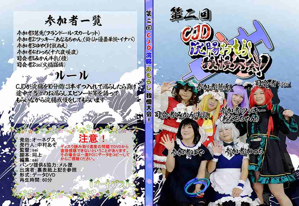 CJDが浣腸を10分間に1本ずつ入れて漏らしたら負け。途中で各々のお漏らしエピソード等を語ってもらいながら浣腸我慢をしてもらいます。参加者1:慧兎 フランドール・スカーレット 参加者2:ツッキー「あなるちゃん」 鈴仙・優曇華院・イナバ 参加者3:ゆや 封獣ぬえ 参加者4:わっち 十六夜咲夜 司会者1:みかん牛乳 橙 司会者2:sei 火焔猫燐 同人サークル